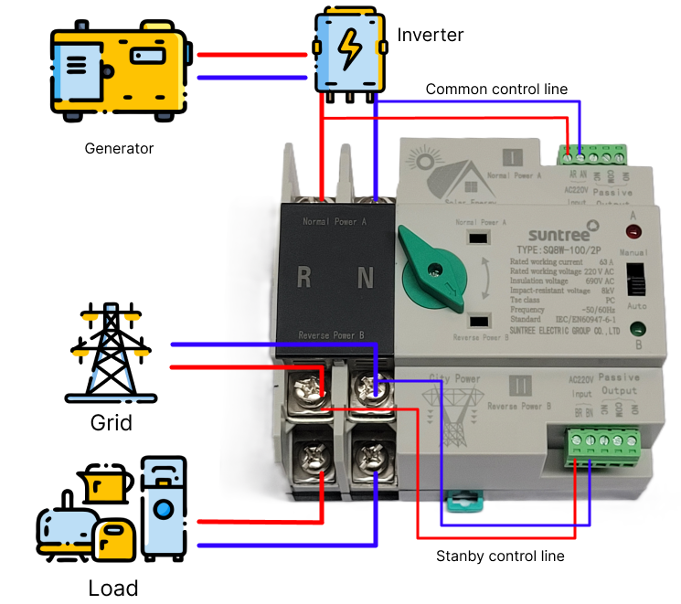 - Seamlessly switch your inverter input between your battery bank and generator.
